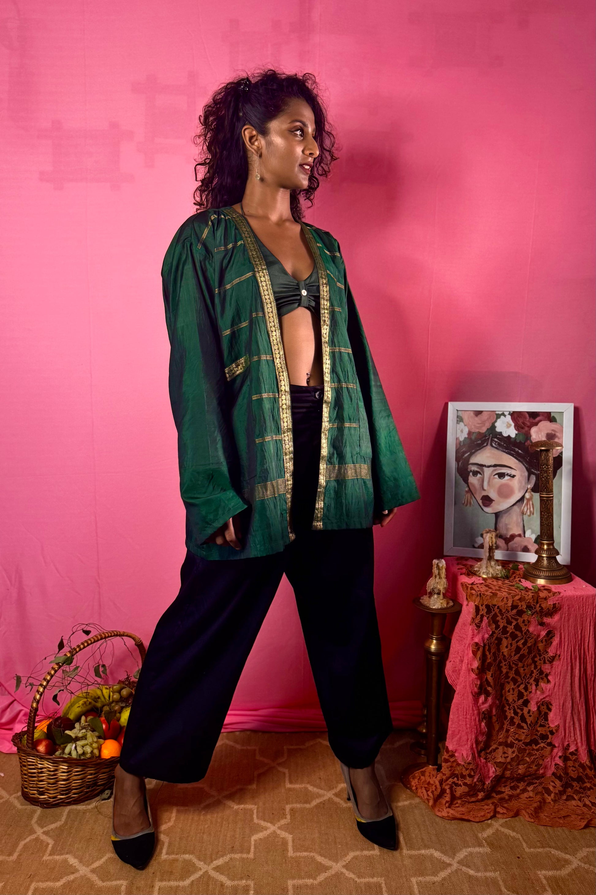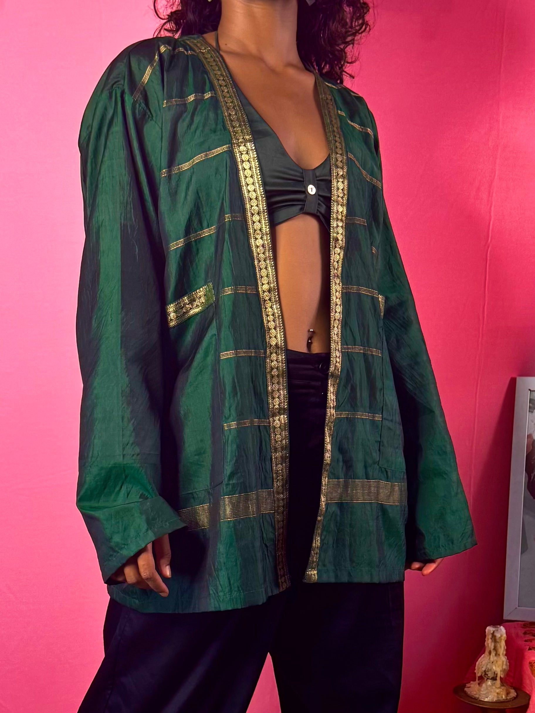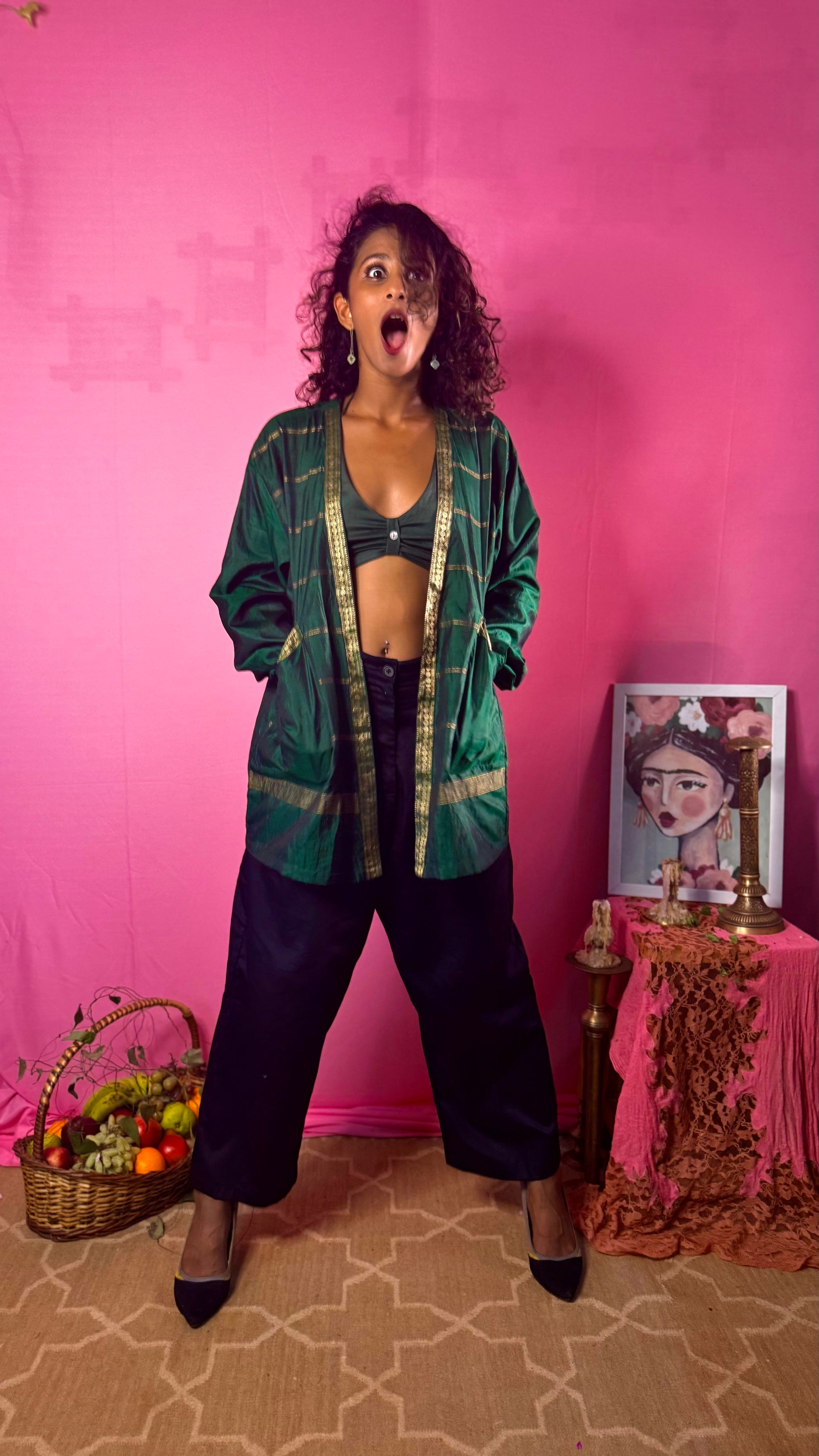 This unisex green silk kimono cardigan exudes understated luxury with its fluid drape and lustrous finish. The rich hue and relaxed silhouette make it a standout layer for effortless, elevated style.