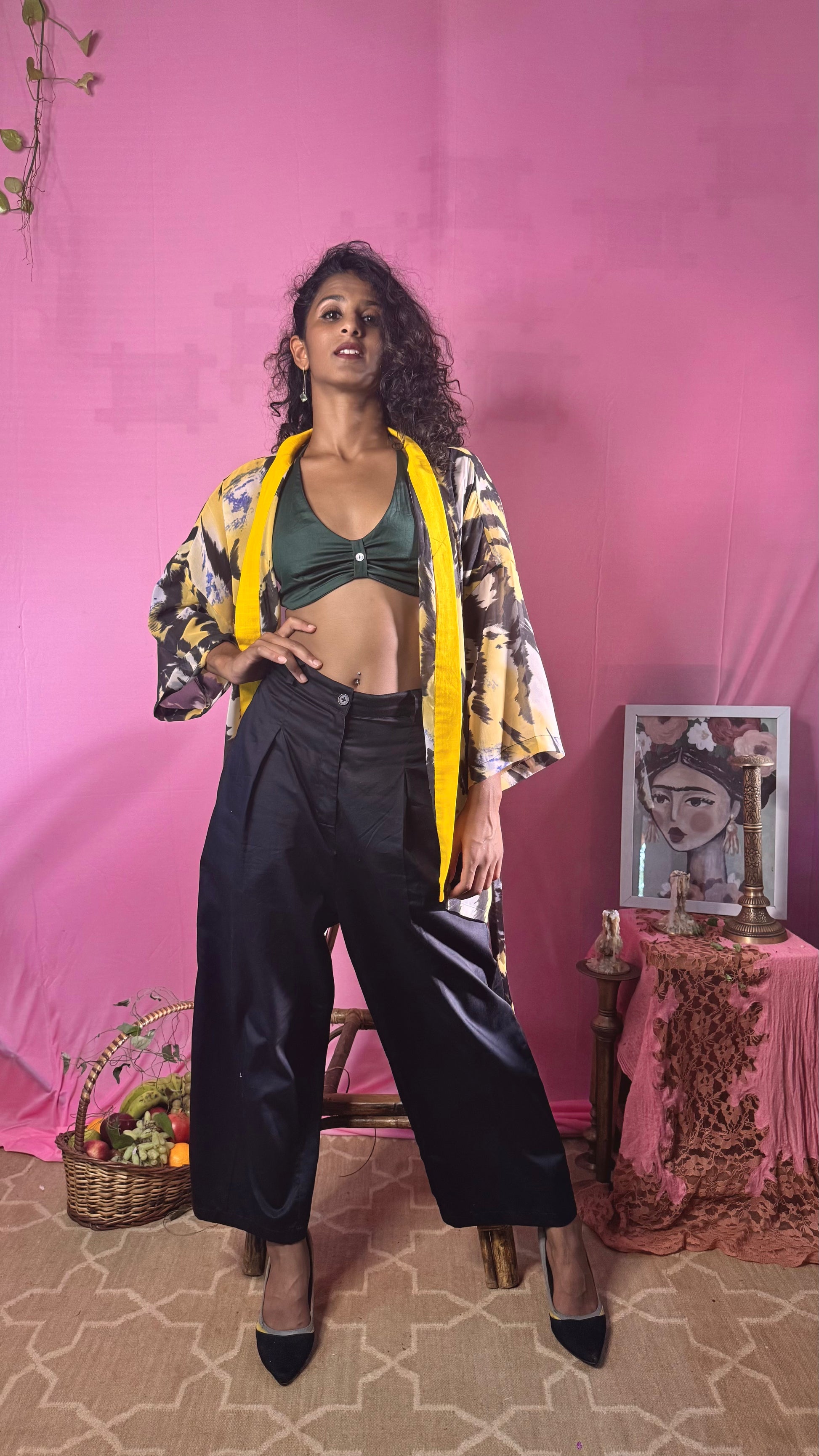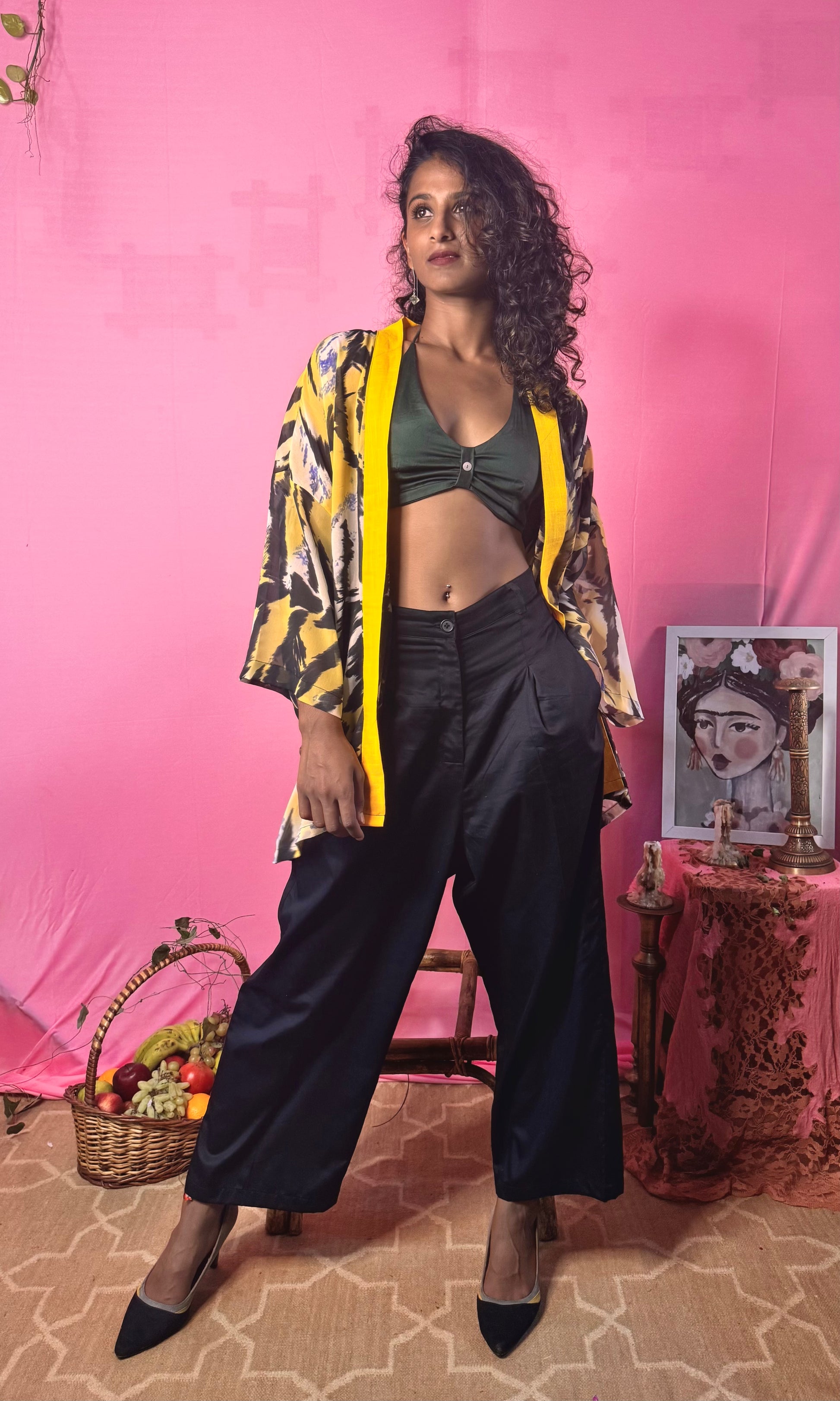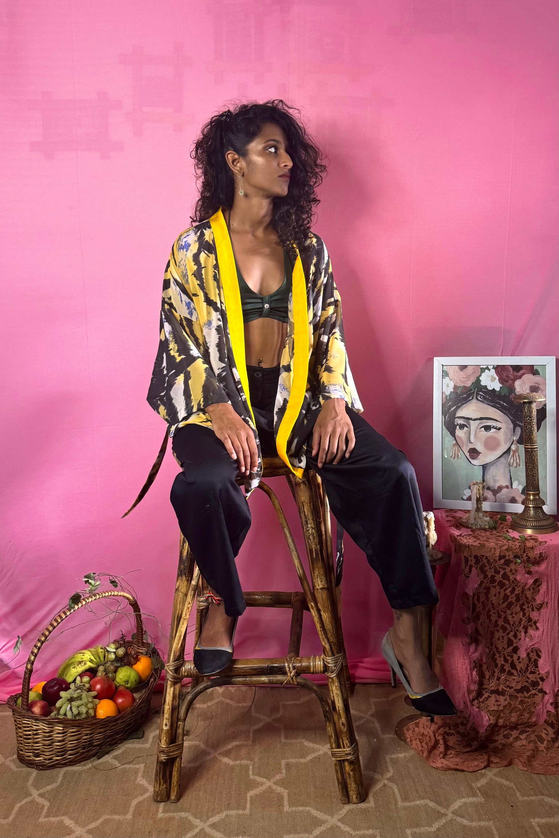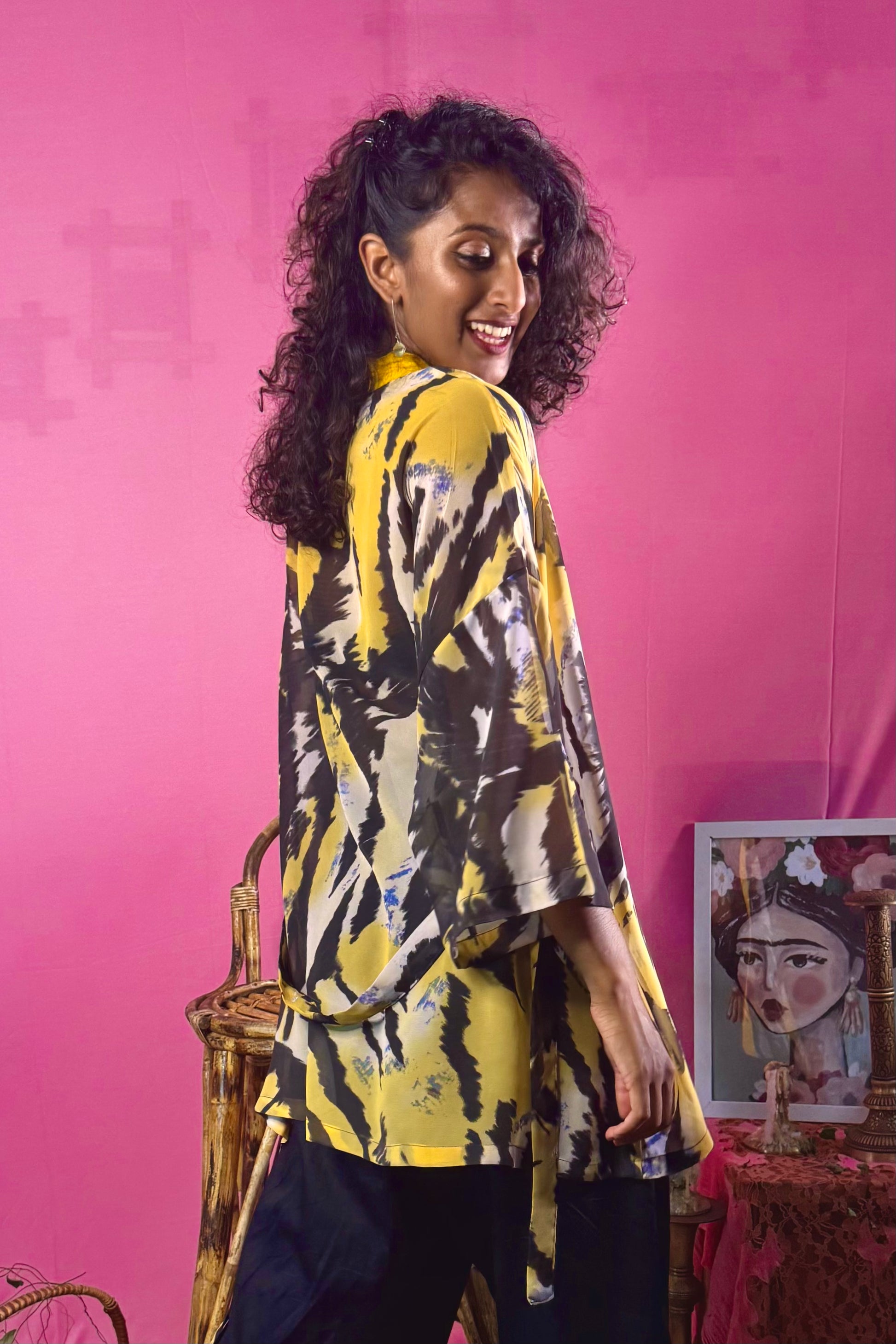 A yellow tiger print short kimono gives off bold, radiant, and playful energy — a blend of wild elegance and sunlit power.
