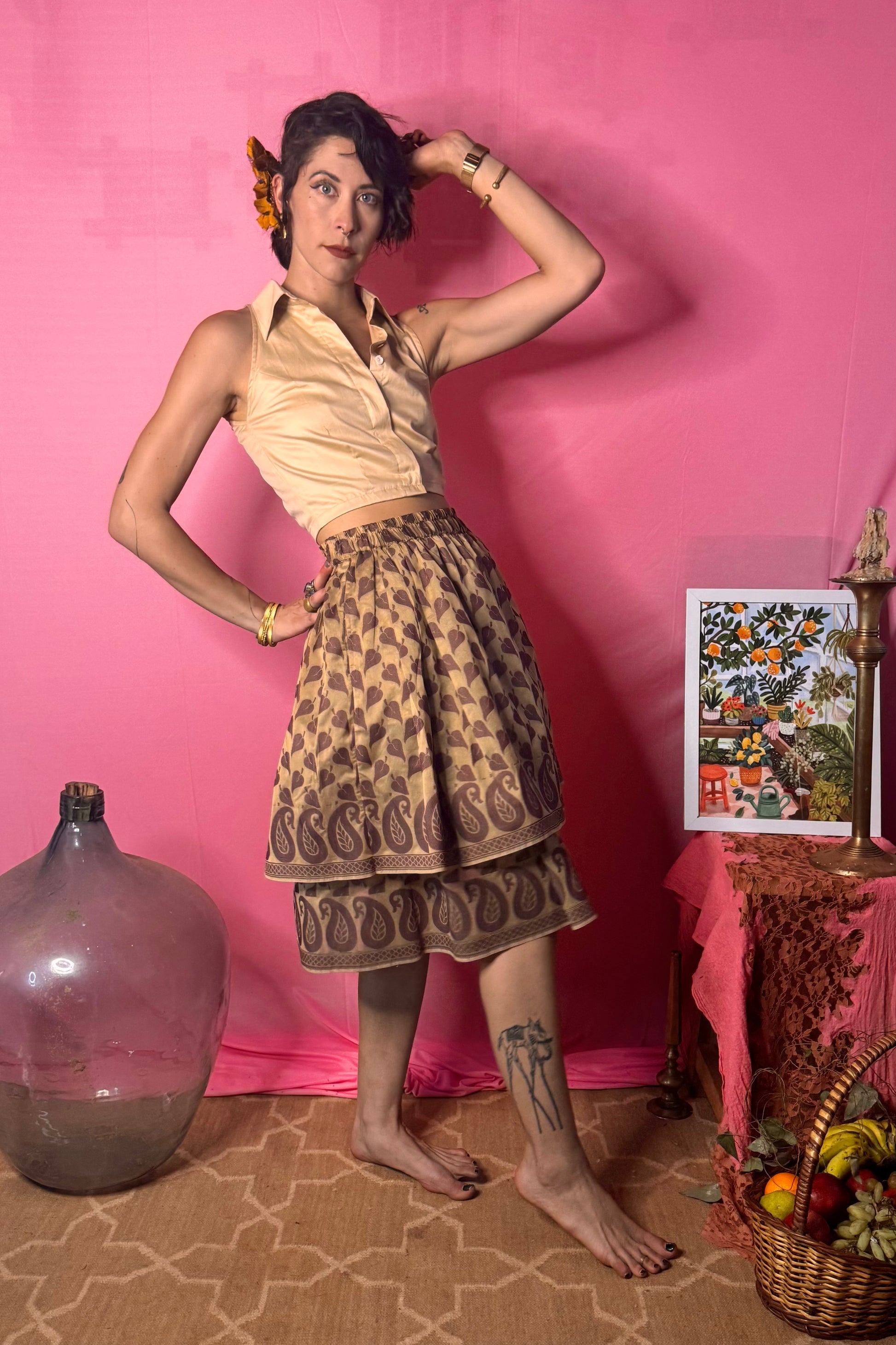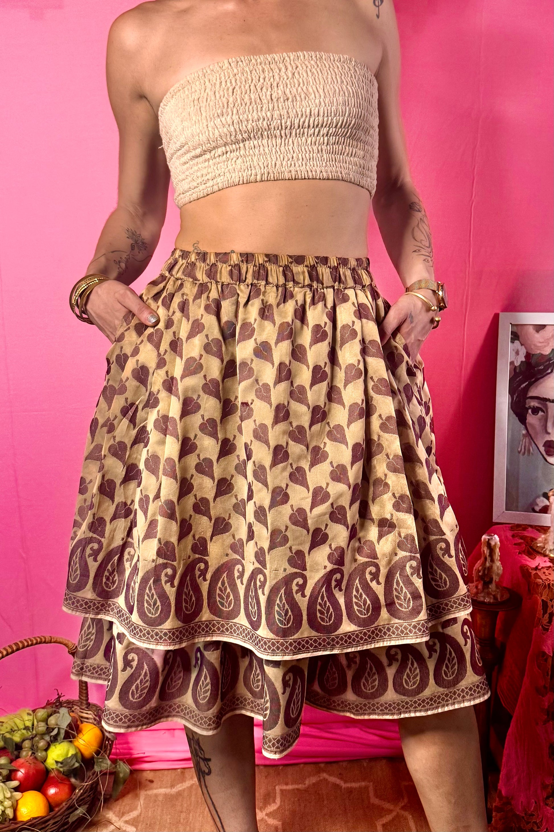 This elegant double-layered cotton silk skirt made from a vintage saree offers elegance with modern flair. Also it has Pockets! Style it with a tube or a crop top and be ready to grab complements.
