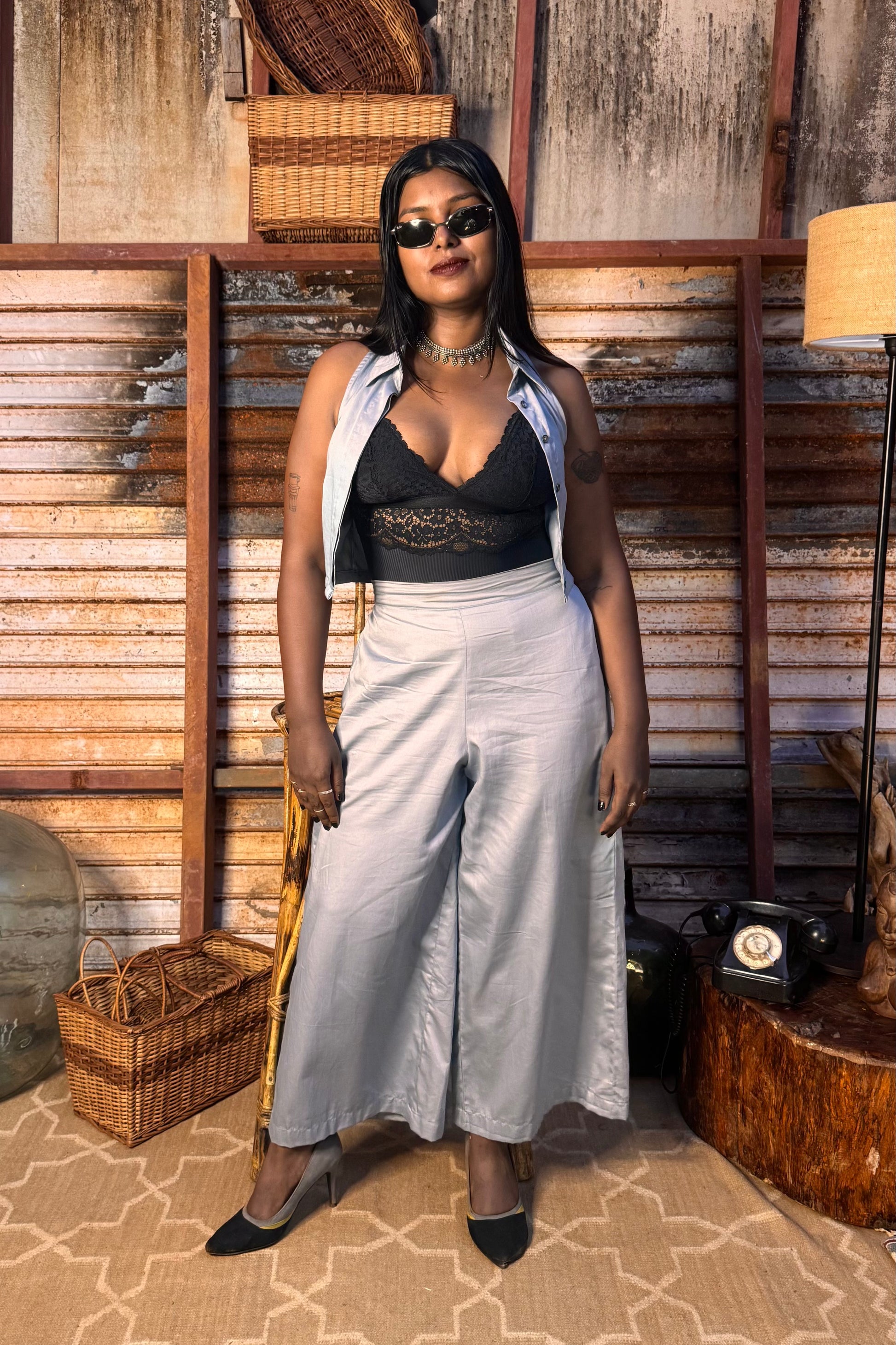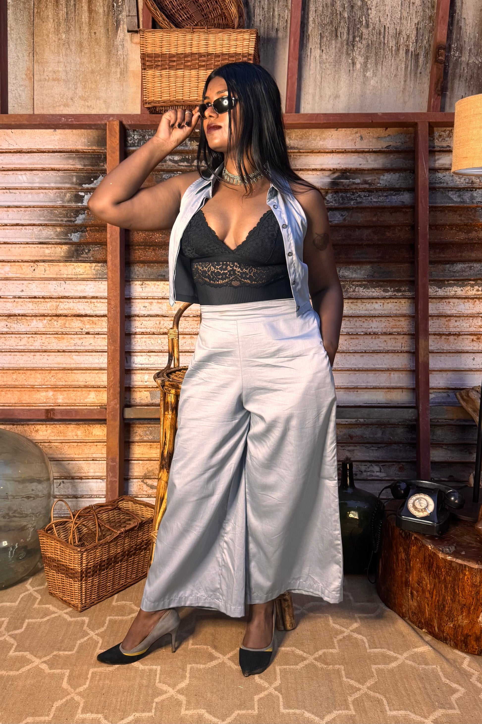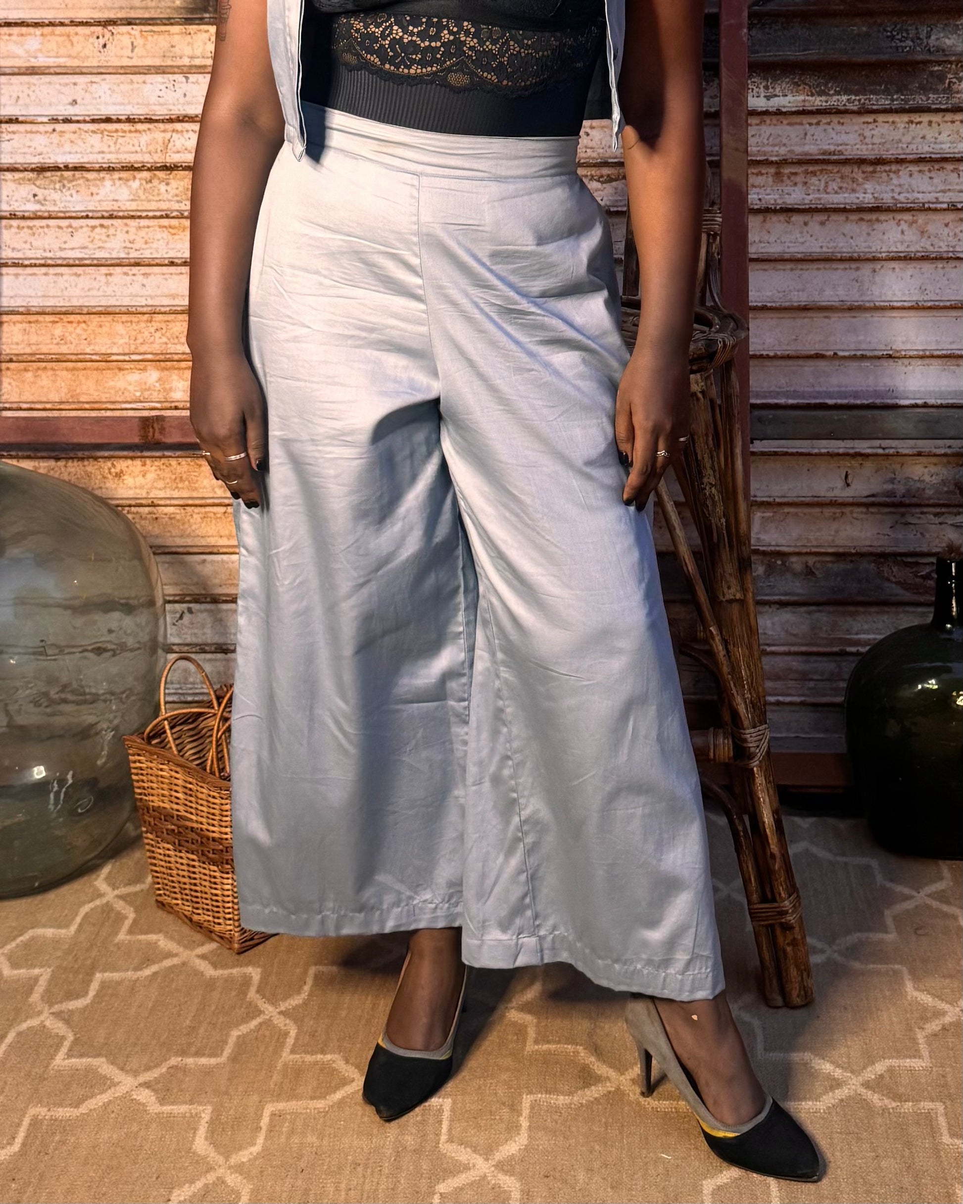 Soft grey cotton pants with a wide palazzo cut for breezy comfort.